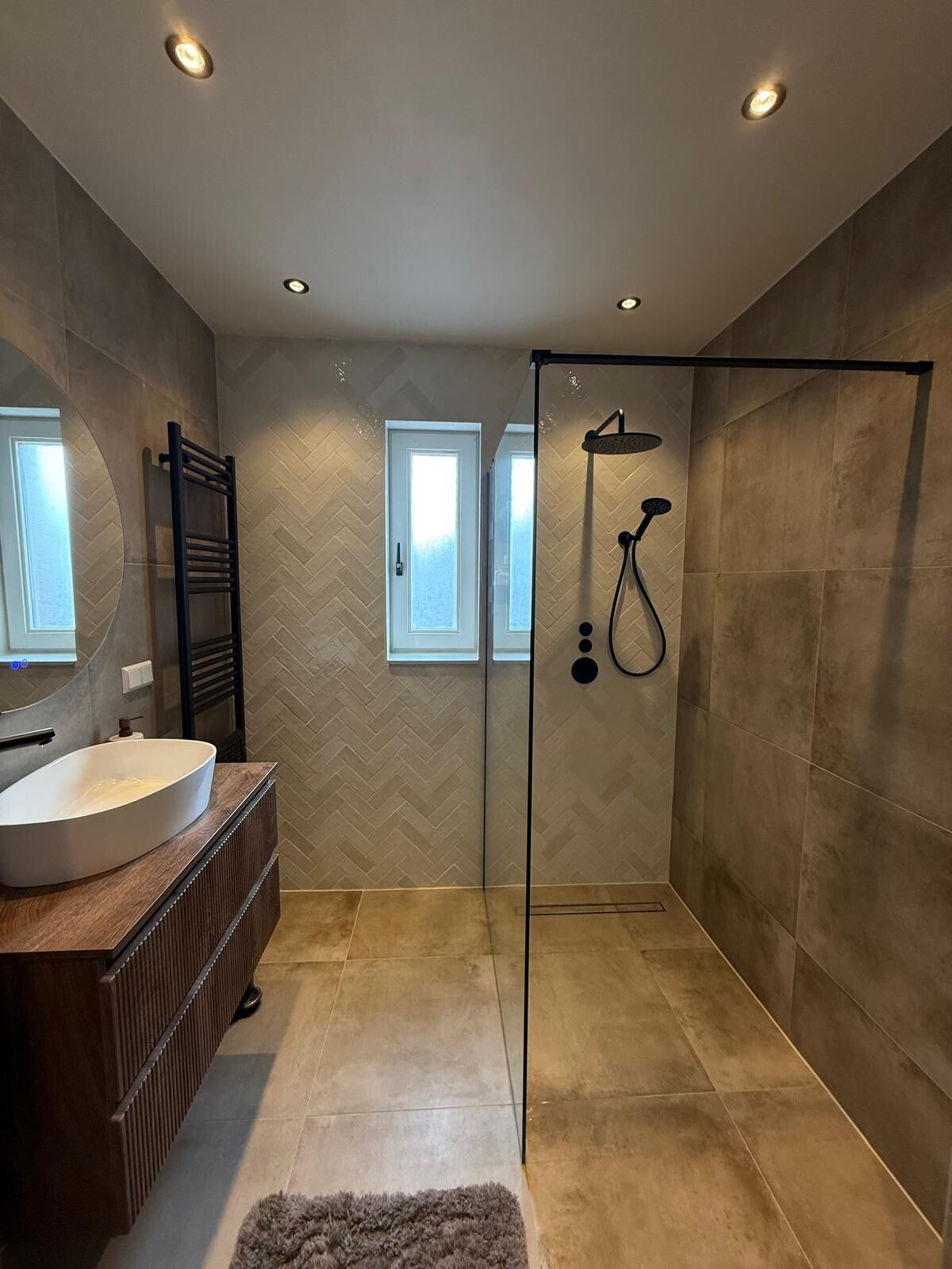 Wij zijn trots om ons project te presenteren: een prachtige en hoogwaardige badkamer die functionaliteit en stijl perfect combineert. De ruimte is voorzien van grote, moderne tegels die zorgen voor een ruimtelijk en strak effect. Als eyecatcher hebben we gekozen voor een stijlvolle vissengraatwand, die de badkamer een unieke uitstraling geeft en het geheel een luxe sfeer bezorgt. Met oog voor detail en kwaliteit hebben we een badkamer gecreëerd die niet alleen praktisch is, maar ook een plek om heerlijk tot rust te komen.